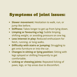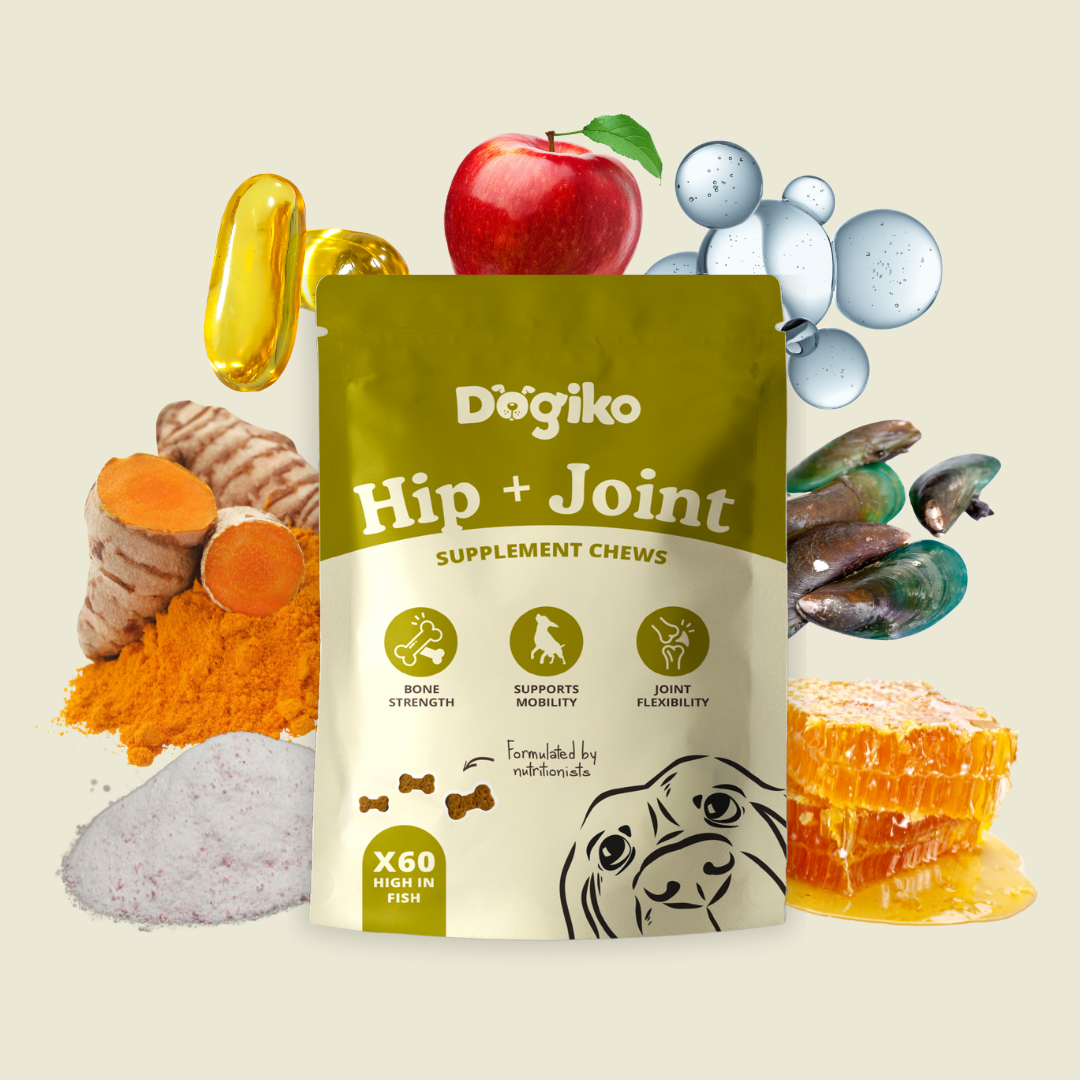 Potato starch, Fish Meal (20% Fish), Glycerine, Glucosamine, Collagen (hydrolysed), Fish Oil, Pea Flour, Vegetable Oil, Methylsulfonylmethane, Honey, Minerals, Curcume Powder, Apple, Green Lipped Mussel, Collagen type 2, Hyaluronic acid.
